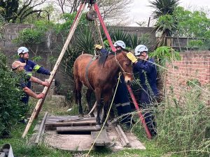 De inmediato, se desplegó un operativo de rescate que incluyó al Departamento de Rescate con Cuerdas del cuartel, quienes realizaron maniobras técnicas y un sistema de anclaje para poder liberar al caballo de forma segura.